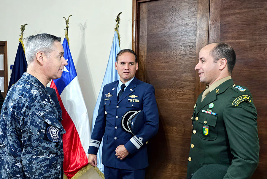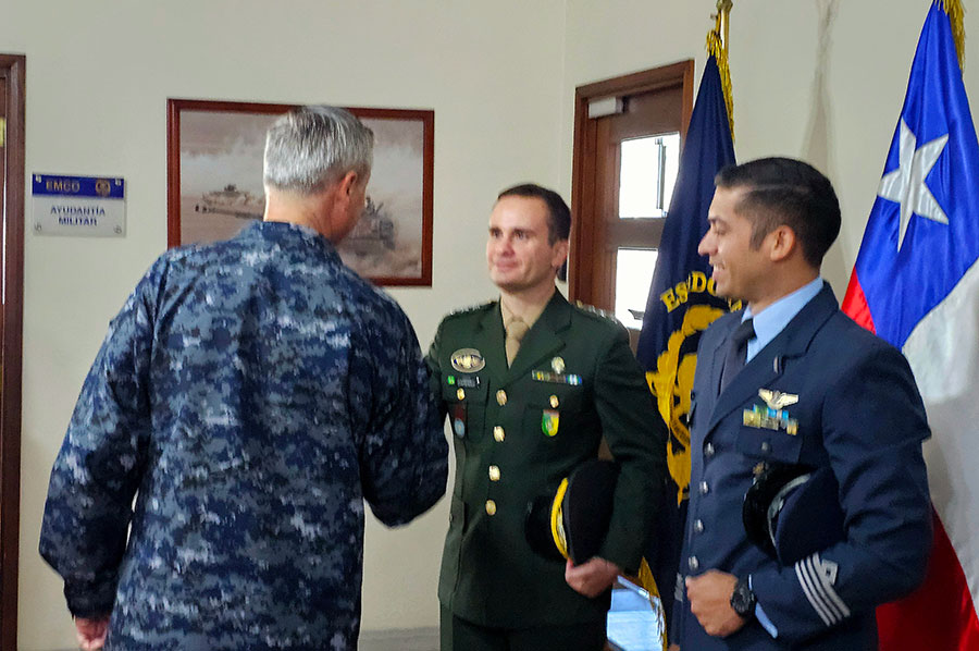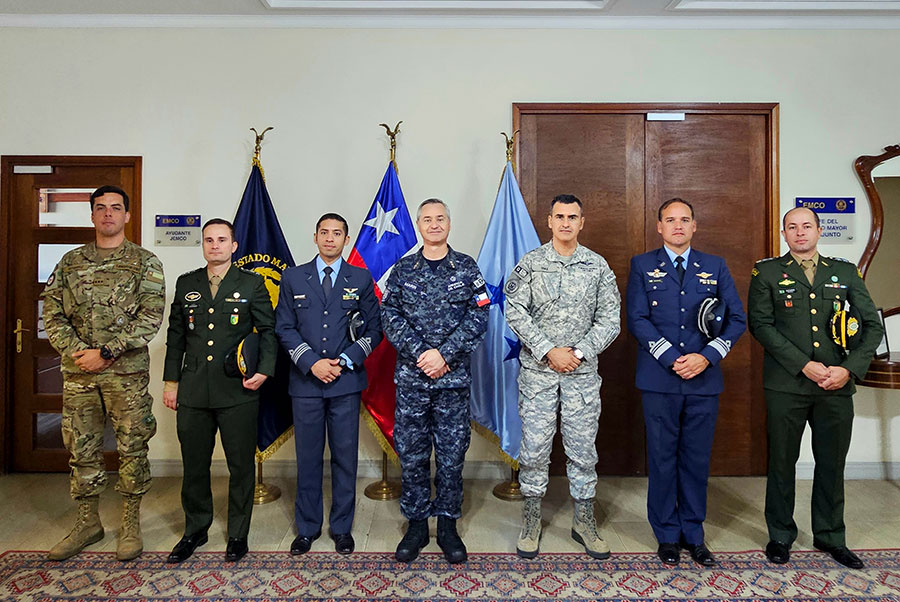 El Jefe del EMCO (s) Vicealmirante Juan Pablo Marín recibió el saludo protocolar por parte de los oficiales instructores extranjeros provenientes de Argentina y Brasil que se desempeñarán durante el presente año en CECOPAC.